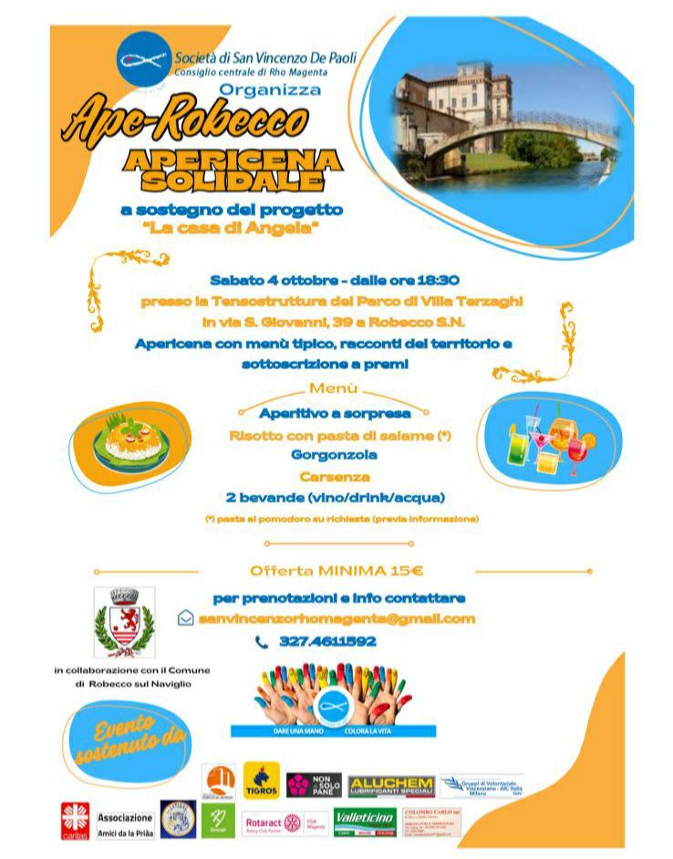 L’apericena del prossimo 4 ottobre a Robecco sul Naviglio sarà possibile solo grazie al supporto delle associazioni locali e degli sponsor che ci sostengono. E’ per questo che vogliamo ricordarli e ringraziarli tutti. Cliccando sull’associazione o sull’attività sarà possibile visitare il loro sito e trovare informazioni sulle loro attività.